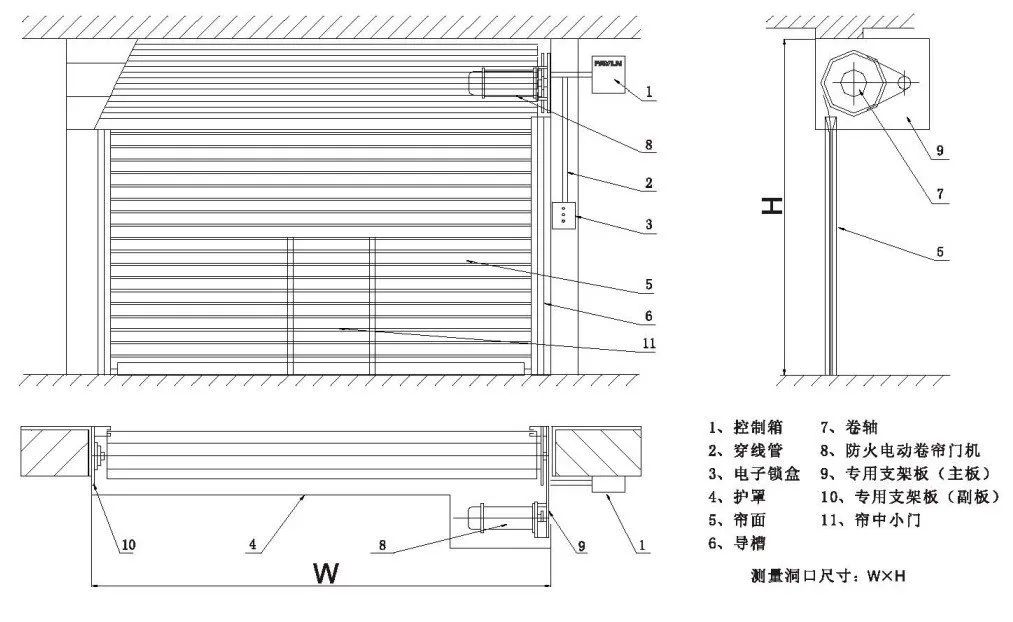 防火卷帘由帘面、导轨、座板、门楣、箱体并配以卷门机和控制箱等结构组成,