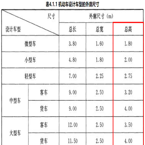 4.1.1 机动车库应根据停放车辆的设计车型外廓尺寸进行设计。机动车设计车型的外廓尺寸可按表4.1.1取值。
