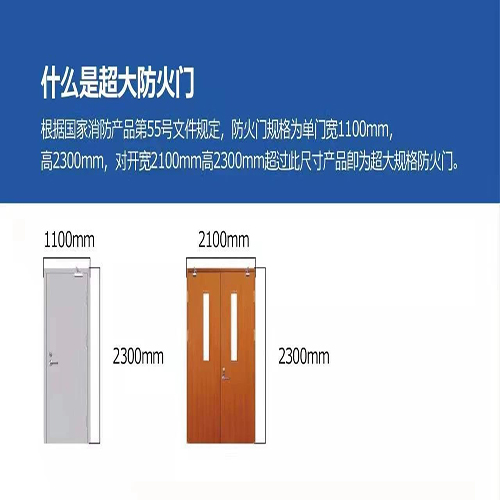 超大尺寸防火门是根据消防产品55号文件规定:防火门单门宽1100mm,高度2300mm;对开宽2100mm,高度2300mm。超过此尺寸产品,称为超大尺寸防火门。