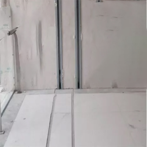 防火卷帘轨道底部用木工板制作与完成面相符的方盒子,从而定位轨道安装尺寸,控制轨道底部与地面面层材料收口。