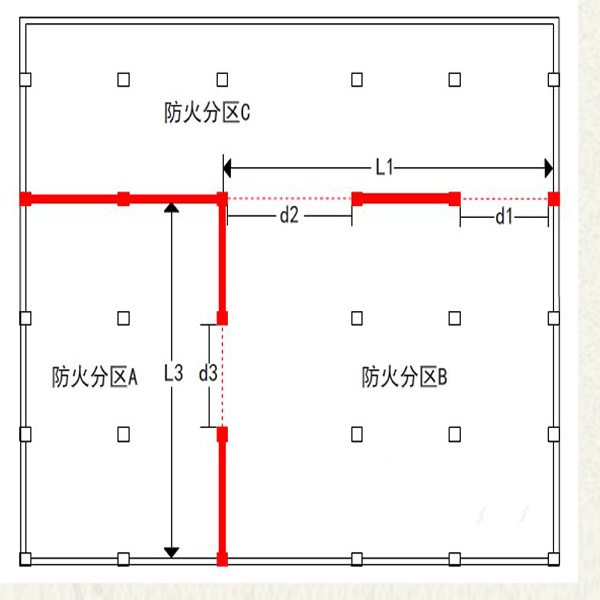如上图所示,防火分区B与防火分区A和防火分区C均相邻。但是防火分区B与防火分区C和防火分区A的分隔部位宽度分别为L1和L3,不应相加计算。其防火卷帘宽度需要分别在相邻两个防火分区处满足规范要求。例如在L1处时,防火卷帘宽度为d2+d1,相对L1满足规范要求。