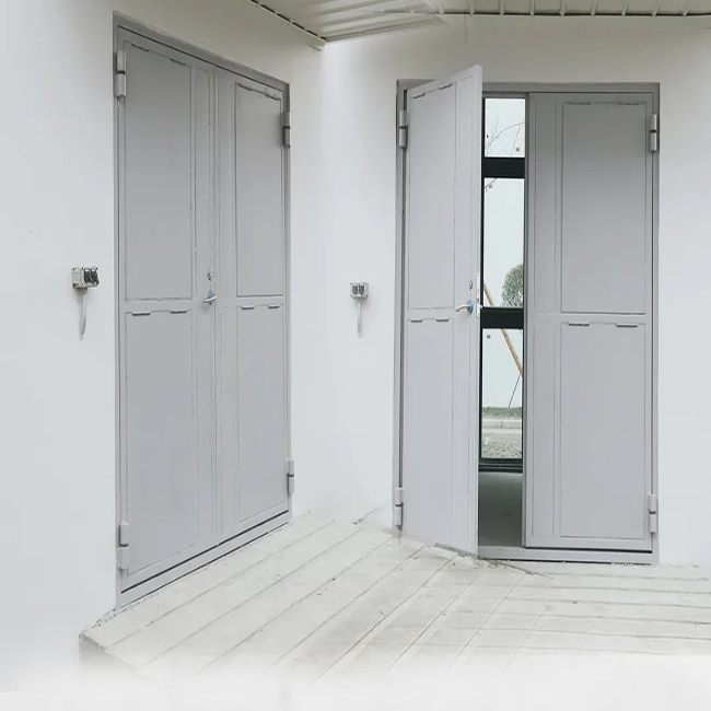 通过泄爆配件或装置使窗开启并释放压力以控制爆炸的产生或使破坏程度降低,泄爆螺栓作用量化泄爆压力值动态控制释放压力门框、门扇面板及其加固件采用碳结构钢板,门框采用3.0mm及以上矩钢型材,门扇面板采用3.0mm以上厚碳结钢板,加固件采用4.0mm-10mm厚钢板,表面采用静电喷塑处理。