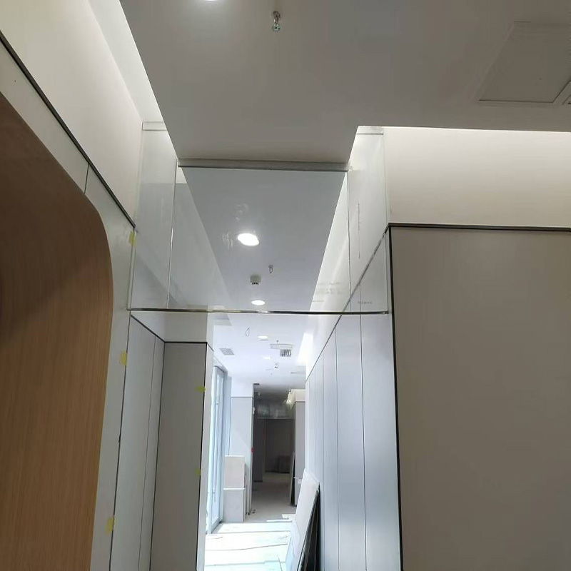 防火玻璃挡烟垂壁安装于吊顶上方可起到很好的美观作用。防火玻璃在加工时就需按照图纸设计进行开孔,方便安装时顺利的吊挂,另外还需采用固定配件,可运用角钢固定,也可采用不锈钢对玻璃两两之间及下方进行包边处理,增强安全性。