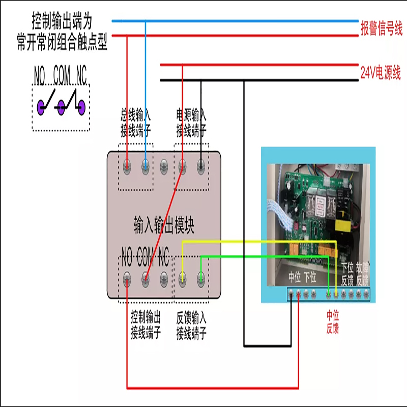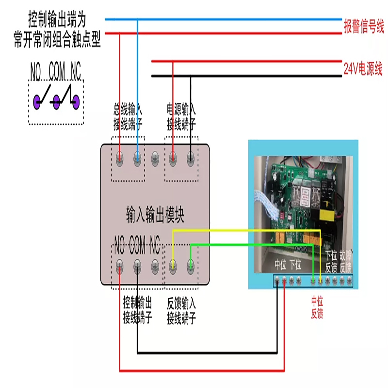如上图所示,图片中的中位和下位是控制触点。通常在主板上会有一个跳线,用来设置控制方式是有源还是无源。本例是卷帘门半降的有源控制方式。