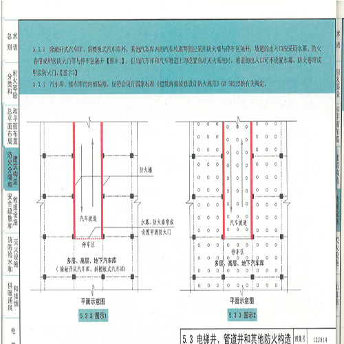 5.3.3 除敞开式汽车库、斜楼板式汽车库外,其他汽车库内的汽车坡道两侧应采用防火墙与停车区隔开,坡道的出入口应采用水幕、防火卷帘或甲级防火门等与停车区隔开;但当汽车库和汽车坡道上均设置自动灭火系统时,坡道的出入口可不设置水幕、防火卷帘或甲级防火门