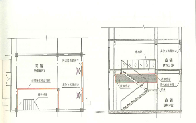 也就是说,对于允许采用敞开楼梯间的建筑,上下层属于不同防火分区,此时在敞开楼梯间的开口部位不设置挡烟垂壁也不违反《烟规》第4.2.1条。敞开楼梯上、下层算一个防火分区,敞开楼梯间上、下层属于不同防火分区。
