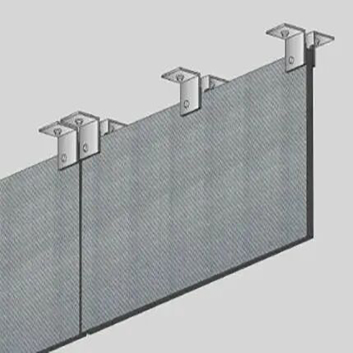 夹层防火玻璃打孔后采用对穿螺栓吊挂的方式与铝合金吊件进行安装固定。