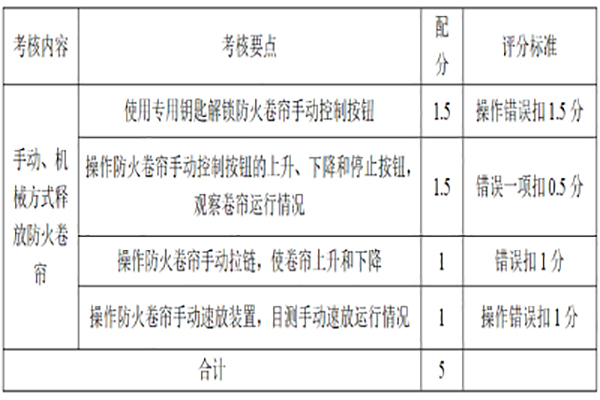 考核内容防火卷帘的手动操作方法。考核标准1.正确操作手动控制按钮,查看防火卷帘动作情况; 2.正确操作手动拉链,查看防火卷帘动作情况; 3.正确操作手动速放装置,查看防火卷帘动作情况。 考核方式模拟操作或现场操作。配分与评分标准