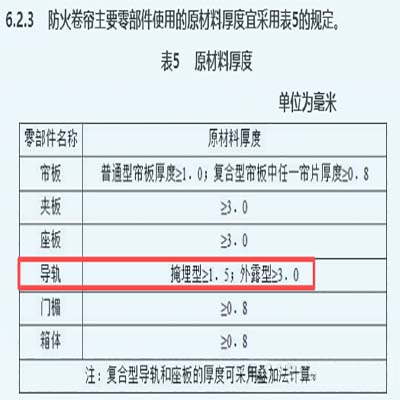 《防火卷帘》GB14102-2005第6.2.3条明确导轨厚度选型。